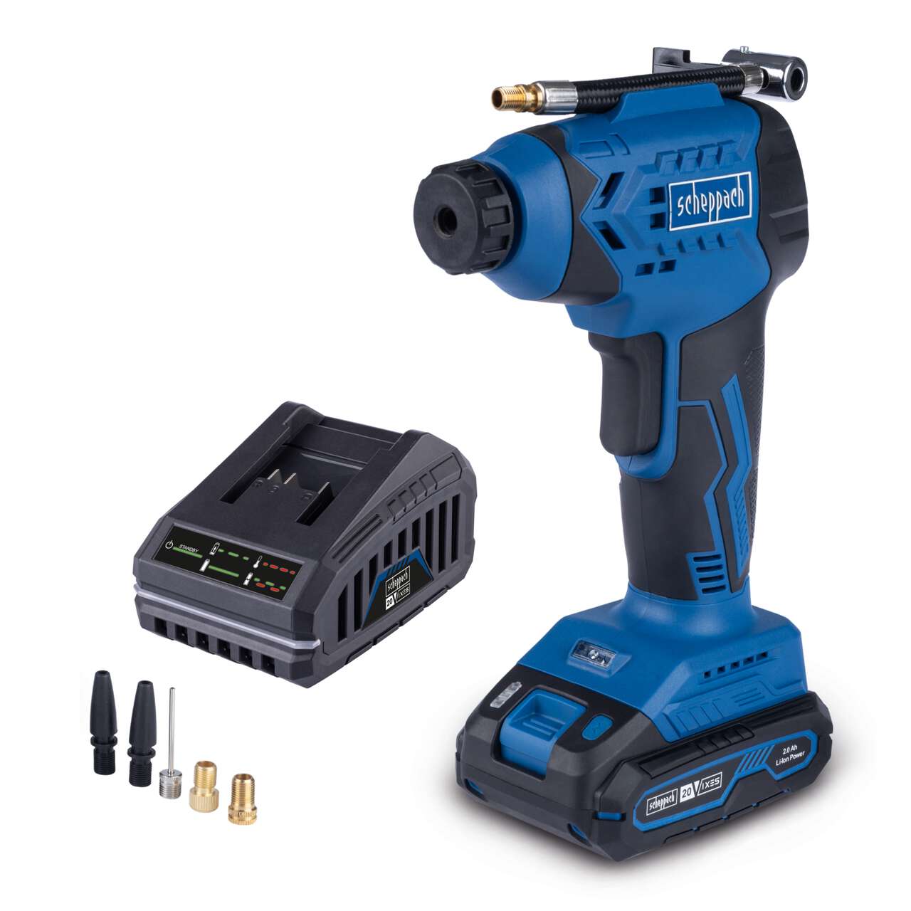 Akku Hand Kompressor C-AC20-X Scheppach 20V – 7 bar Arbeitsdruck | LCD Display | LED Leuchte | 6-tlg Zubehörset | inkl. 2Ah Akku + 2,4A Ladegerät