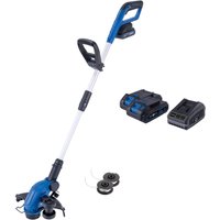 Der Scheppach Akku-Rasentrimmer C-LT300-X SET S ist ein leistungsstarker Helfer für den heimischen Garten und eignet sich ideal für Engstellen oder zum Schneiden von Rasenkanten. Mit Hilfe der teleskopierbaren und stufenlos in der Länge verstellbaren Führungsstange kann die Höhe individuell an die Nutzergröße angepasst werden und ermöglicht so ein ergonomisches Arbeiten. Der Motorkopf ist neigbar sowie um 90° drehbar, sodass auch senkrechte Flächen oder Rasenkanten bequem bearbeitet werden können. Als Teil der Scheppach IXES 20-Volt-Serie können alle Akkus und Ladegeräte der Systemreihe mit dem Rasentrimmer kombiniert werden. Akku und Ladegerät sind separat erhältlich. Leistungsstarker Akku-Rasentrimmer für Engstellen oder zum Schneiden von Rasenkanten Praktische 2in1-Funktion: Rasentrimmern und Kantenschneiden Kabelloses Arbeiten mit der Scheppach IXES 20-Volt-Serie – alle Akkus und Ladegeräte aus der Systemreihe können mit dem Akku-Rasentrimmer kombiniert werden Einzelfadensystem mit vollautomatischer Fadennachführung Um 90° drehbarer sowie neigbarer Motorkopf – ideal für vertikale Flächen und Rasenkanten Um 270 mm teleskopierbare Führungsstange – für eine ergonomische Arbeitshaltung Einfacher und werkzeugloser Spulenwechsel Rutschfester Softgrip-Griff mit Sicherheitsschalter 1,6 mm Nylon-Einzelfaden mit 300 mm Schnittbreite Distanzrolle für ein sauberes Schneiden der Rasenkanten Verstellbarer Zusatzgriff Ausklappbarer Pflanzenschutzbügel schützt Blumen, Pflanzen und andere empfindliche Objekte vor Beschädigungen inklusive 2x 2Ah Akku + 2,4A Ladegerät Inklusive 2x Fadenspule (1x vormontiert)