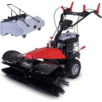 Die scheppach Benzin Kehrmaschine SC2200PE inklusive Sammelbehälter erleichtert Ihnen die Arbeit ungemein, wenn Sie große Flächen reinigen wollen. Durch den Elektro-Start und den zuschaltbaren Radantrieb mit 3 Vorwärts- und 1 Rückwärtsgang schaffen Sie die Arbeit ohne Anstrengung. Durch große Kehrbreite von 100 cm in Verbindung mit dem starken 173 cm³, 4,9 PS Vier-Takt-Motor ist die Arbeit im Handumdrehen geschafft. Drehzahlverstellung der Kehrbürste Separat zuschaltbarer Radantrieb 3 Vorwärtsgänge und 1 Rückwärtsgang Winkel- und höhenverstellbare Kehrbürste Kehrbürste separat zu- und abschaltbar Höhenverstellbarer Handgriff Antriebsrad mit Stollenprofil für beste Fahreigenschaften unabhängig vom Untergrund 3 Stufen Bedienhebel (Motor Stop / Drehzahl / Choke) Elektro-Start und Seilzugstarter Inklusive großem Auffangbehälter Bürgersteig, Straße, Einfahrt, Stellfläche, Vorplatz – ein großes Grundstück will gepflegt werden. Das bedeutet im Frühjahr, Sommer und Herbst vor allem kehren und im Winter Schnee schieben. Wer viel geteerte oder gepflasterte Flächen zu reinigen und pflegen hat, der ist in Gedanken schnell bei einer eigenen Kehrmaschine, um sich die Arbeit zu erleichtern. Die scheppach SC2200PE Kehrmaschine mit Sammelbehälter macht das Reinigen von befestigten Wegen und Flächen zum Kinderspiel. Mit höhenverstellbarem Komforthandgriff, zuschaltbarem Radantrieb und drei Vorwärts- sowie einem Rückwärtsgang lässt sich das Gerät komfortabel über die zu reinigenden befestigten Flächen manövrieren. Durch die große Kehrbreite von 100 cm in Verbindung mit dem leistungsstarken 173 cm³, 4,9 PS Vier-Takt-Motor ist die Arbeit im Handumdrehen erledigt. Der Elektro-Start des Motors mithilfe des eingebauten 12 V Akkus macht anstrengendes Anziehen am Startseilzug überflüssig. Alternativ ist jedoch auch ein Start über den Seilzugstarter möglich. Für ein optimales Ergebnis ist die Kehrbürste in Winkel und Höhe verstellbar, auch die Drehzahl lässt sich anpassen. Laub, Schmutz und Streugut können direkt in dem vor der Kehrbürste montierbaren Auffangbehälter eingesammelt werden. Im Winter ist der Schnee mit dem optionalen 105 cm langen Schneeschild schnell geräumt. Optional können die Schneereste dann mit der Kehrbürste im gleichen Arbeitsschritt beiseite gekehrt werden – kein festgetretener Schnee, keine Glatteisgefahr. Dazu lässt sich die Kehrbürste separat zu- oder abschalten. Egal bei welcher Witterung, auf nassem Laub oder vereistem Boden – die großen luftgefüllten Laufräder mit Stollenprofil sorgen für den optimalen Halt unabhängig vom Untergrund.