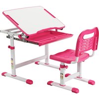 Sind Sie noch auf der Suche nach einem Tisch und Stuhl für Kinder? Dieses Set ist perfekt für Kinder ab 4 Jahren geeignet, da beide Möbelstücke verstellbar sind. Die Konstruktion aus hochwertigem MDF und Metall ist robust und langlebig. Der Stuhl kann bis zu 100 kg und der Tisch bis zu 60 kg tragen. Sie müssen sich also keine Sorgen um die Zuverlässigkeit machen. Die Tischplatte kann zum Lesen, Schreiben und Zeichnen gekippt werden. Eigenschaften: Höhenverstellbares Set: Sowohl Tisch als auch Stuhl können verstellt werden, um mit dem Kind zu wachsen. Außerdem sind sie fest konstruiert und fördern eine gesunde Sitzhaltung. Gepflegtes Design für Kinder: Dieser bequeme und ergonomische Stuhl fördert eine gesunde Sitzhaltung. Außerdem wird durch die Schlitze eine gute Luftzirkulation gewährleistet. Robuste Konstruktion und sicheres Material: Das robuste Material garantiert eine langfristige Nutzung. Der Tisch kann mit 60 kg und der Stuhl mit 100 kg belastet werden. Die MDF- und PP-Materialien sind zuverlässig und langlebig. Langsame und sichere Tischplatte: Die Tischplatte kann von 0 bis 45° geneigt werden und eignet sich somit für eine Vielzahl von Aktivitäten. Dadurch wird ein hohes Maß an Komfort erreicht. Einfache Montage und Reinigung: Die Schutzbeschichtung macht den Tisch kratzfest. Außerdem lässt er sich einfach und schnell mit einem feuchten Tuch reinigen. Da alle benötigten Teile im Lieferumfang enthalten sind, dauert der Aufbau nur wenige Minuten. Merkmale: Mit Stiftrillen auf der Arbeitsfläche, um Stifte in Reichweite zu halten, die Schultasche kann an eleganten Metallhaken aufgehängt werden. Und robuste, um 0-45° kippbare Tischplatte zum Lesen, Schreiben, Zeichnen usw. Stifte usw. beschreibende Arbeitsfläche, leicht zu reinigenTechnische Daten: Farbe: rosa Material: MDF, PP, Eisen Maße Tischplatte: 66,5 x 47 cm (L x B) Maße Tisch: 66,5 x 50 x 52-77 cm (L x B x H) Maße Stuhl: 46 x 36 x 62-78 cm (L x B x H) Sitzhöhe: 31-44 cm Nettogewicht: 14 kg Belastbarkeit der Tischplatte: 60 kg Belastbarkeit des Stuhls: 100 kg Altersempfehlung: ab 4 Jahren Lieferumfang: 1 x Tisch 1 x Stuhl 1 x Anleitung.