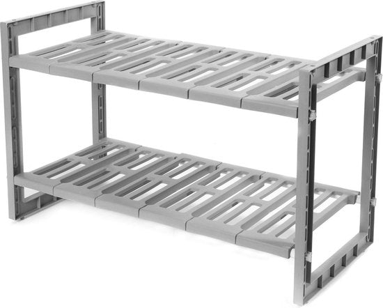 Ein einfaches, aber äußerst praktisches Regal für Ihren Spülenschrank. Dieses Regal ist in der Breite von 48 bis 85 cm ausziehbar, wodurch es sich leicht an jeden Spülenschrank anpassen lässt. Die Einlegeböden sind demontierbar, so dass das Regal leicht um den Siphon herum platziert werden kann. Dieses Spülbeckenregal ist aus robustem und langlebigem grauem Kunststoff gefertigt. Mit seinen zwei Ebenen bietet er reichlich Stauraum. Da es ausziehbar ist, lässt sich dieses Spülbeckenregal leicht an den vorhandenen Platz anpassen. Das Regal hat eine Breite von 48 cm, eine Tiefe von 30 cm, eine Höhe von 40 cm und kann auf 85 cm Breite ausgezogen werden. Organisieren Sie Ihren Spülenschrank Es ist praktisch, viele Dinge in Ihrem Spülenschrank aufzubewahren, wie Spülmittel, Handtücher, Geschirrtücher, Spülbürsten, Schwämme und mehr. Leider führen diese kleinen, losen Gegenstände oft zu Unordnung in Ihrem Spülenschrank. Wie können Sie Ihren Spülenschrank effektiv organisieren? Mit diesem Unterschrankregal von Compactor für Ihren Spülenschrank können Sie alles an einem praktischen Ort aufbewahren. Passen Sie das Regal unter der Spüle an Ihren Schrank an und platzieren Sie all Ihre Utensilien ordentlich darauf. Noch nie war es so einfach, einen Spülenschrank zu organisieren! Möchten Sie ein Untertischregal kaufen? Sie möchten ein Regal?