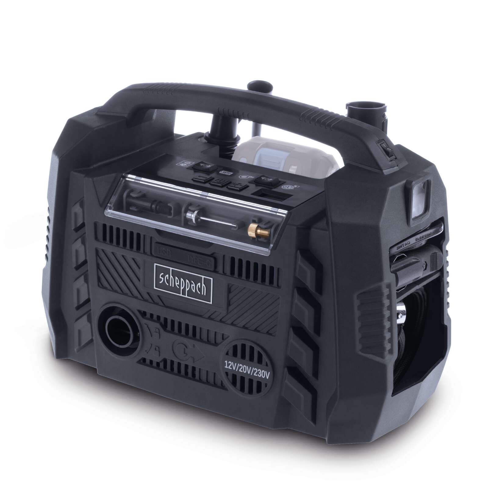 Der Scheppach Akku-Kompressor C-HYC360BE-X sorgt für Druckluft unterwegs. Dank Hybrid-Funktion ist der Kompressor besonders flexibel einsetzbar: Der C-HYC360BE-X verfügt über drei Antriebsarten und kann über ein Stromkabel, einen leistungsstarken 20 Volt Akku sowie einen 12 Volt Anschluss betrieben werden. Der maximale Arbeitsdruck von 10,3 bar wird ganz einfach über das übersichtliche Bedienpanel eingestellt. Im Lieferumfang sind außerdem ein Ventiladapter, eine Ballnadel, ein konischer Adapter für Schwimmzubehör, ein Hochdruckschlauch 75 cm sowie ein Gebläseschlauch 44 cm enthalten. Als Teil der Scheppach IXES 20-Volt-Serie können alle Akkus und Ladegeräte der Systemreihe mit dem Hybrid-Kompressor kombiniert werden. Akku und Ladegerät sind separat erhältlich. Handlicher, mobiler Kompressor – ideal für unterwegs, fürs Auto oder zum Aufpumpen von Bällen, Reifen oder Luftmatratzen Kabelloses Arbeiten mit der Scheppach IXES 20-Volt-Serie – alle Akkus und Ladegeräte aus der Systemreihe können mit dem Hybrid-Kompressor kombiniert werden Maximal 10,3 bar Arbeitsdruck Hybridfunktion mit 3 Antriebsarten sorgt für größtmögliche Flexibilität – mit Stromkabel (230 V), Akku (20 V) oder Zigarettenanzünder im PKW verwendbar Praktische Gebläsefunktion beispielsweise zum Aufblasen von Luftmatratzen 2 integrierte USB-Anschlüsse (1x USB-A, 1x USB-C), ideal zum Laden von Smartphones, Tablets, etc. Einfaches Einstellen des Arbeitsdrucks über das übersichtliche Bedienpanel Digitaldisplay zeigt den aktuellen Arbeitsdruck an Kabel und Zubehör können direkt am Gerät sicher und platzsparend verstaut werden Kompakte Bauform zur platzsparenden Aufbewahrung und praktischer Tragegriff für einfachen Transport Mit Auto-Shut-Off bei Erreichen des eingestellten Drucks Wählbare Einheiten für den Druck: Bar, PSI und kPa LED-Arbeitsleuchte erleichtert das Arbeiten bei schlechten Lichtverhältnissen Ölfreier Kompressor und dadurch wartungsarm Akku und Ladegerät separat erhältlich Inklusive Ventiladapter, Ballnadel, konischer Adapter (Schwimmzubehör), Hochdruckschlauch 75 cm, Gebläseschlauch 44 cm