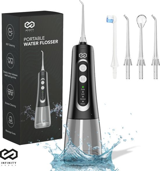 Infinity Goods Water Flosser – Oral Washer – Elektrische Zahnseide – Schnurlos und wiederaufladbar – 5 Aufsätze – Schwarz