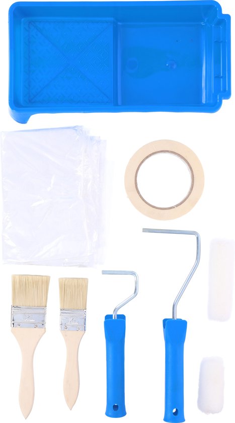 Planen Sie zu streichen? Dann ist es praktisch, vorher einige Malutensilien im Haus zu haben. Dieses 9-teilige Malset von Kinzo enthält folgende Artikel: 1x 10-Zentimeter-Streichrolle mit mittlerer Florlänge 1x 5-Zentimeter-Streichrolle mit mittlerer Florlänge 1x 38-Millimeter-Pinsel 1x 50-Millimeter-Pinsel 1x großer Farbbügel (für 10-Zentimeter-Rolle) 1x kleiner Farbbügel (für 5-Zentimeter-Rolle) 1x Rolle Malerband (4 Meter lang, 19 Millimeter breit) 1x Abdeckfolie (4 x 2,5 Meter) 1x Farbwanne Dann können Sie loslegen. Verwenden Sie die Abdeckfolie und das Malerband, um sorgfältig zu markieren, was Sie streichen wollen. So vermeiden Sie Farbspritzer an unerwünschten Stellen. Füllen Sie etwas Farbe in die Farbwanne, befestigen Sie die richtige Walze am Farbgriff und los geht’s!.