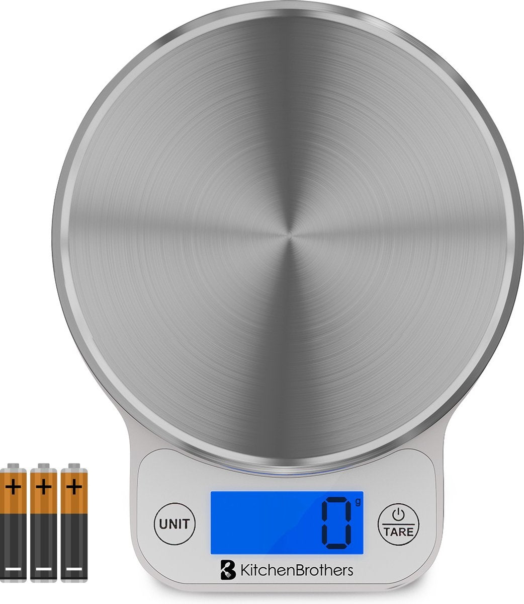 KitchenBrothers Küchenwaage – Waage Küche Digital – 1 g bis 6 kg – Tara Funktion – Batterien enthalten – Edelstahl/Weiß