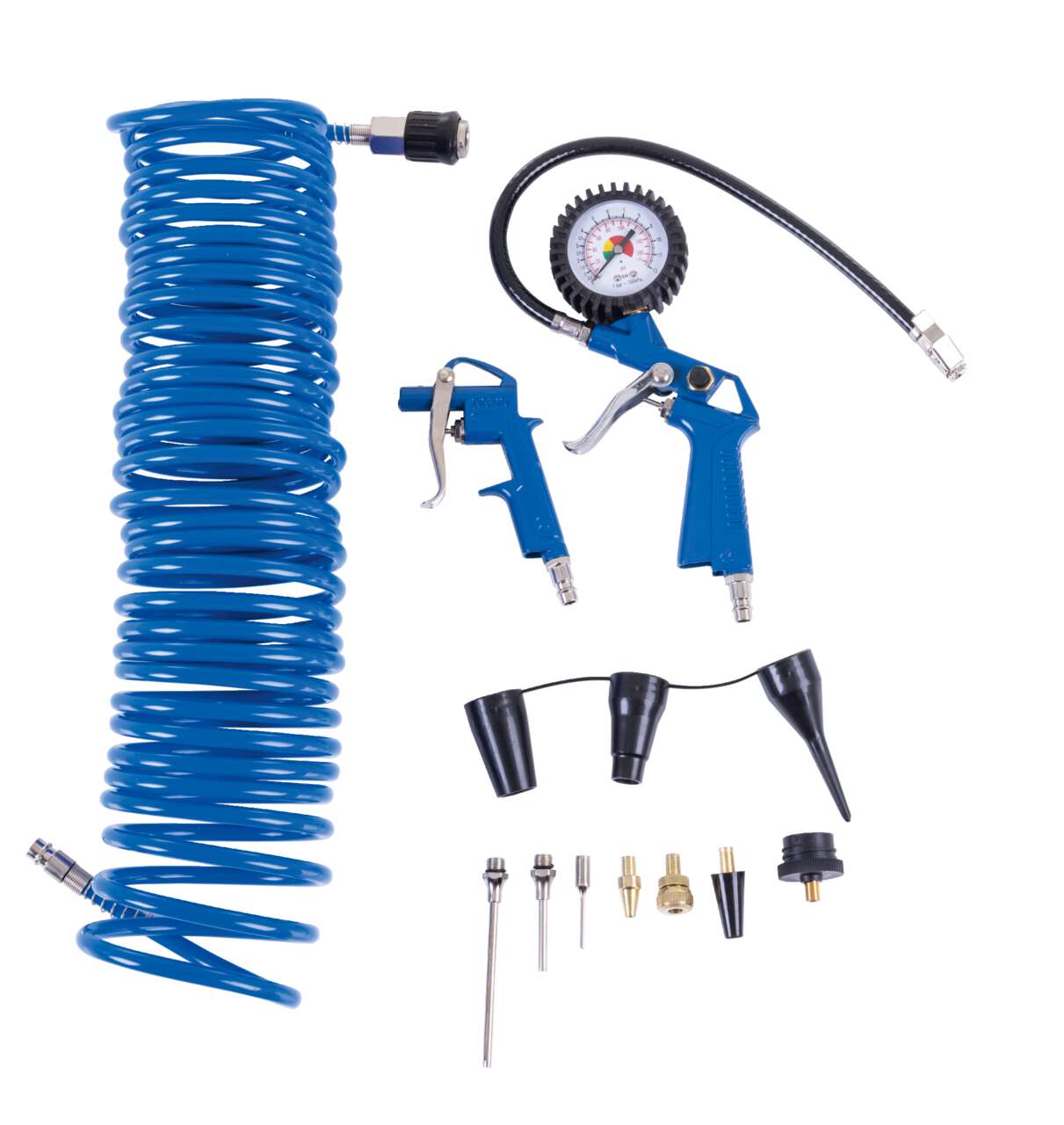 Scheppach Kompressor Zubehör Set 14-teilig Lieferumfang: – Reifenfüllmessgerät – mit gummiertem Manometer, Skala in bar/psi, Luft-Ablass-Ventil – Blaspistole – für die Reinigung und Trocknung von Oberflächen und Geräten – 11 x verschiedene Zubehörteile (Schlauch, Düsen, etc.) – 10m Spiralschlauch