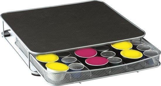 Kapselhalter mit Ständer Ein Metallkapselhalter für 60 Kaffeetassen. Passt unter die meisten Kaffeemaschinen. Die Oberseite hat einen rutschfesten Boden. Die Unterseite enthält 4 rutschfeste Füße. Größe: ca. 32x29x6cm. Nicht geeignet für Dolce Gusto Kapseln.