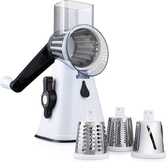 Nimma Trommelreibe – Inklusive 3 Aufsätzen und Spiralschneider – geeignet als Käsereibe und Reibe – Weiß