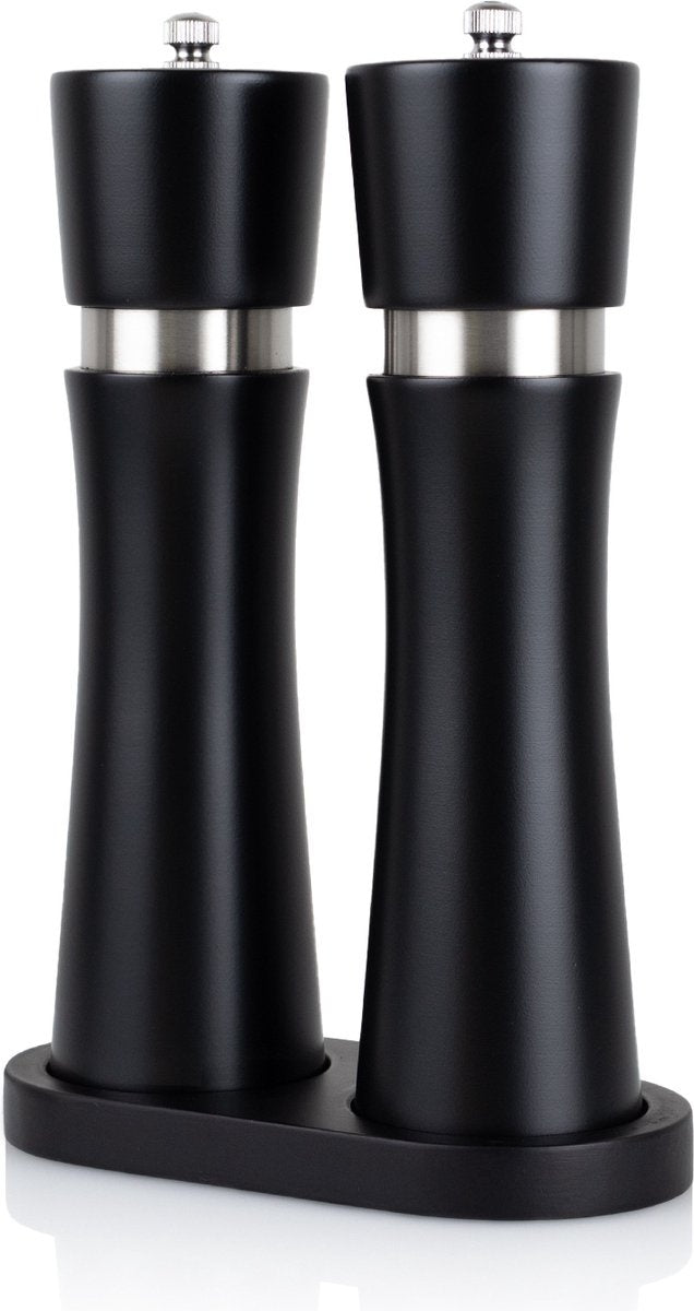 Es sieht immer unschön aus, wenn Salz- und Pfeffermühlen nicht zusammenpassen. Zum Glück gibt es das Nimma Salz- und Pfeffermühlenset! Dieses stilvolle Set kann die Küche so zusammenbringen. Außerdem sind die Mühlen nicht nur stilvoll, sondern auch von höchster Qualität! Das Nimma Salz- und Pfeffermühlenset Hochgradig einstellbar Stylisch Effizientes Nachfüllen Nachhaltig Denken Sie daran, dass dieses Produkt nicht für fein gemahlenes Salz oder Pfeffer geeignet ist, verwenden Sie stattdessen grobe Salz-/Pfefferkörner, damit der einstellbare Mahlgrad genutzt werden kann. Perfekt einstellbarManchmal ist bei einem Gericht eine etwas gröbere Salzkörnung erwünscht, aber zum Backen möchte man das Salz so klein wie möglich haben. Das Salz- und Pfeffermühlenset von Nimma lässt sich einfach und schnell einstellen, so dass Sie jederzeit eine grobe oder feine Mahlung genießen können! Dazu dreht man die Schraube an der Mühle nach links für einen feinen Mahlgrad und nach rechts für einen gröberen Mahlgrad. StylischAbgesehen von der perfekten Einstellbarkeit ist das Nimma Salz- und Pfeffermühlenset auch sehr stilvoll. Es sieht in jeder Küche elegant aus und sein minimalistisches Design ist ein echter Blickfang. Die Mühlen sind zudem sehr langlebig, da sie aus echtem Akazienholz gefertigt sind und somit eine lange Lebensdauer haben werden. EffizientAufgrund des Fassungsvermögens von 88ml wird das Nachfüllen der Mühlen nicht oft vorkommen, aber wenn es nötig ist, ist es zum Glück sehr einfach und schnell zu erledigen! Wenn man die Schraube löst und den oberen Teil abnimmt, hat man schnellen Zugriff auf das Innere der Mühle. Dann können Sie den Löffel benutzen, um Ihr Salz oder Ihren Pfeffer schnell und ohne Unordnung hineinzubekommen! Spezifikationen Behälter: Salzmühle, Pfeffermühle, Nachfülllöffel, Ständer Marke: Nimma Material: Akazienholz, Keramik, Edelstahl Farbe: Schwarz Gewicht: 710 Gramm Abmessungen: 20 x 5,5 x 5,5 cm Inklusive Nachfülllöffel: Ja Keramikmahlwerk: Ja Stylisch: Ja Geeignet für: Privater oder professioneller Gebrauch