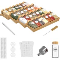 Noswo Gewürzregal Schublade – Mit 28 Gläsern – Komplettset – Quadratisch – Streudeckel und Etiketten – Gewürz-Organisator – Küchenschubladen-Organisator – Bambus