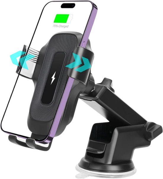 Dieser Telefonhalter hält Ihr Smartphone fest in Position im Auto. So können Sie unbesorgt freihändig navigieren. Die Handyhalterung ist mit einem kabellosen 15W-Ladegerät und einem robusten Saugnapf ausgestattet. So können Sie jede Schwelle überqueren, ohne dass sich Ihr Telefon löst oder wackelt. Diese Halterung ist für Smartphones mit einer maximalen Bildschirmgröße von 7 Zoll geeignet. Sicher unterwegsGeben Sie Ihr Ziel ein oder spielen Sie Ihre Lieblingsmusik ab, befestigen Sie Ihr Smartphone in horizontaler oder vertikaler Position an der Handyhalterung und schon kann es losgehen. Der starke Saugnapf hält Ihr Telefon an Ort und Stelle und hilft, gefährliche Situationen zu vermeiden. Kabelloses LadenDer Halter kann Telefone mit Gehäusen, die dünner als 5 mm sind, aufladen. Entfernen Sie metallische/magnetische Gegenstände, Kreditkarten oder Clips, um optimale Ladeergebnisse zu erzielen. Robuster SaugnapfDer Saugnapf ist so konzipiert, dass er eine starke Saugkraft und stabile Haftung auf flachen Oberflächen bietet. Sie müssen den Saugnapf reinigen? Spülen Sie ihn mit warmem Wasser ab und lassen Sie ihn dann an der Luft trocknen. Außerdem ist der Handyhalter berührungsempfindlich. Mit einem einfachen Knopfdruck können Sie ihn öffnen oder schließen, so dass Sie Ihr Telefon leicht herausnehmen können. Handyhalter- Ausgestattet mit einem leistungsstarken 15W Schnellladegerät. – Geeignet für Qi-kompatible Smartphones.- Mit einem robusten Saugnapf.- Ideal für Freisprechanrufe und Navigation. – Geeignet für Telefone bis zu 7 Zoll. – Mit verstellbaren Armen und einer 360°-Schwenkfunktion. Technische Daten- Material: ABS.- Farbe: schwarz.- Geeignet für die Anbringung am Armaturenbrett, am (horizontalen) Lüftungsgitter oder an der Windschutzscheibe.- Hinweis: Zum schnellen Aufladen wird ein QC 3.0 Autoadapter benötigt (nicht im Lieferumfang enthalten). Wollen auch Sie sicher im Straßenverkehr unterwegs sein, sorglos freihändig navigieren und gleichzeitig Ihr Telefon aufladen? Dann bestellen Sie jetzt diese praktische Handyhalterung!