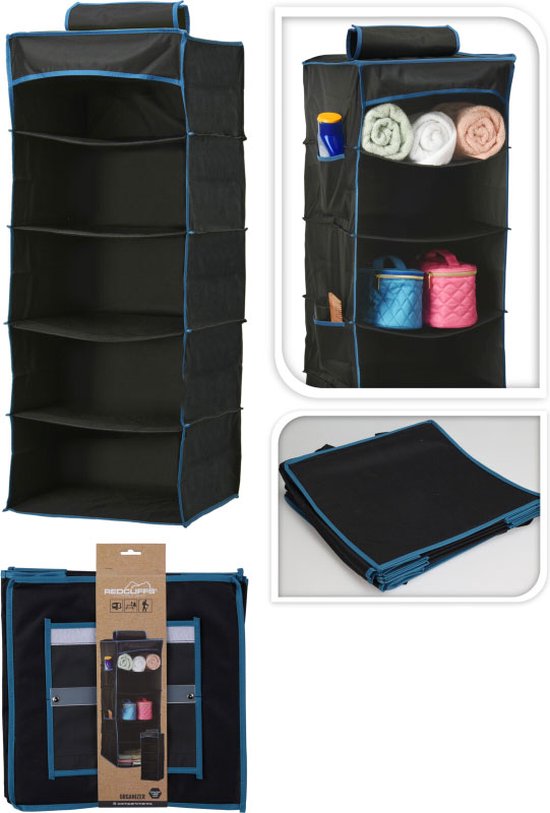 Redcliffs Tent Organizer – Hängeorganizer mit 5 Fächern – 34x34x85 cm Organisieren Sie alles auf Abenteuern und zu HauseDer Redcliffs Tent Organiser ist die ideale Lösung für alle, die gerne zelten oder mit dem Wohnwagen unterwegs sind, aber eine zusätzliche Hilfe bei der Organisation der täglichen Dinge brauchen. Dieser faltbare, hängende Organizer ist nicht nur funktionell und geräumig, sondern auch robust. Ideal für z. B. Handtücher usw. Geräumig &, vielseitigMit 5 geräumigen Aufbewahrungsfächern und 2 praktischen, kleineren Aufbewahrungsfächern an der Seite bietet dieser Hänge-Organizer viel Platz für all Ihre wichtigen Dinge. Ob Kleidung, Toilettenartikel, Campingausrüstung oder Haushaltsgegenstände, alles findet in diesem vielseitigen Organizer seinen Platz. Perfekt für verschiedene AnlässeOb Sie nun campen, mit dem Wohnwagen reisen oder einfach nur zusätzlichen Stauraum zu Hause benötigen, der Redcliffs Tent Organizer ist die perfekte Lösung. Mit den Maßen 34x34x85 cm passt er in die meisten Vorzelte und Wohnwagen, lässt sich aber auch zu Hause in einem Schrank oder an einem Haken gut verwenden. Hochwertiges MaterialDieser Hänge-Organizer ist aus 600D Oxford-Polyester gefertigt und garantiert Langlebigkeit und Qualität. Das Material ist PU-beschichtet, was den Organizer wasserabweisend macht und ihn ideal für den Einsatz in feuchten Umgebungen oder im Freien macht. Stärker als Standard-OrganizerDer Redcliffs Tent Organizer ist von höherer Qualität als herkömmliche Schrank-Organizer, d. h. er ist so konzipiert, dass er den Herausforderungen auf Reisen und beim Camping standhält. Seine Robustheit sorgt dafür, dass er nicht nur länger hält, sondern auch mehr aufnehmen kann. Leicht zu tragen und zu verstauenWenn Sie fertig sind oder sich auf den Weg zu Ihrem nächsten Abenteuer machen, lässt sich der Organizer leicht auf eine kompakte Größe zusammenfalten und nimmt nur wenig Platz in Ihrem Gepäck oder in Ihrem Schrank ein. Kurz und gut,Der Redcliffs Tent Organizer ist ein Muss für jeden, der Ordnung und Stil schätzt, sowohl beim Camping als auch zu Hause. Seine Haltbarkeit, Vielseitigkeit und Benutzerfreundlichkeit machen ihn zur idealen Wahl für einen organisierten Lebensstil. Top-Form Top-Form