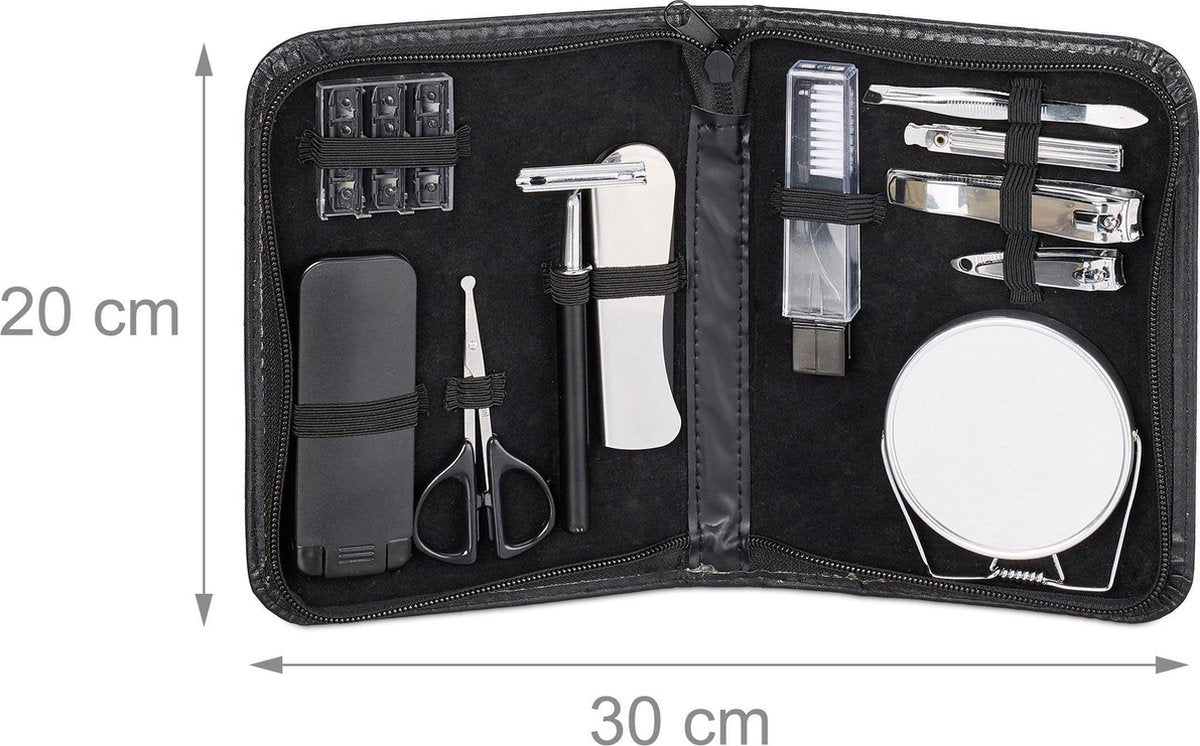 Gut auf sich selbst aufpassen? Das ist für Männer natürlich genauso wichtig wie für Frauen. Mit diesem umfassenden Pflegeset sind Sie mit den wichtigsten Werkzeugen auf einen Schlag ausgestattet. Verschiedene Scheren, Kämme, Nagelknipser, Rasierapparate, eine Reisezahnbürste, ein Kompaktspiegel und das alles in einem schicken Lederetui.Das Bart- und Maniküre-Set für den gepflegten Mann ist nicht nur für das Badezimmer, sondern auch auf Reisen als handliches Set ideal, um Barthaare und Fingernägel in Form zu halten. Mit dem umfangreichen Lederetui sind Sie immer auf der sicheren Seite, wenn es um einen makellosen Look geht. Neben dem Rasiermesser mit passenden Klingen erhalten Sie im Set mehrere Teile für ein gepflegtes Erscheinungsbild, sei es die beiden Nagelknipser oder die Bart- und Nasenhaarschere. Bestellen Sie Ihr Pflegeset und überzeugen Sie sich selbst von den praktischen Werkzeugen.Inhalt:- Wiederverwendbarer Rasierer inklusive 4 Ersatzklingen.- Bartschere.- Bartkamm.- Nagelfeile.- Nagelknipser.- Nagelhautknipser.- (Reise-)Zahnbürste.- Fusselbürste.- Pinzette.- Kompaktspiegel auf Ständer.- Aufbewahrungsetui aus Leder mit Reißverschluss.Einzigartige Spezifikationen,- Anzahl der Teile: 11 Stück.- Geeignet für Bartpflege, Maniküre und allgemeine Körperpflege.- Praktisch für zu Hause und unterwegs.- Wird in einem eleganten (Kunst-)Lederetui geliefert.