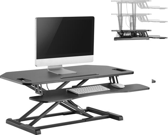 Ein hochwertiger Steh-Sitz-Schreibtisch, der speziell entwickelt wurde, um eine ideale ergonomische Höhe für sitzende und stehende Arbeit zu schaffen. Stellen Sie diesen verstellbaren Schreibtischaufsatz auf Ihren festen Schreibtisch und genießen Sie einen komfortablen und ergonomischen Arbeitsplatz mit Höhenverstellung. Die integrierte Ausgleichsgasfeder mit Kneifgriff ermöglicht einen schnellen Wechsel zwischen Sitzen und Stehen. Die Mindesthöhe beträgt 11 cm, die Maximalhöhe 50 cm. Mit einer großzügigen Arbeitsfläche von 95 cm Breite und 46 cm Tiefe bietet er ausreichend Platz für einen oder zwei Monitore. Die Tastaturablage ist 94,5 cm breit und 30 cm tief und bietet sowohl Rechts- als auch Linkshändern genügend Platz für ihre Maus. Dieser Tischaufsteller eignet sich auch hervorragend für die Verwendung an einem festen Ecktisch. Die empfohlene Höchstbelastung beträgt 15 kg. Einfache und schnelle Montage. Die Lieferung erfolgt inklusive Montageanleitung und aller benötigten Teile.