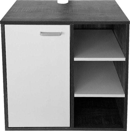 Dieser praktische Unterschrank ist perfekt für jedes Badezimmer. Der Schrank wurde platzsparend entworfen und bietet reichlich Stauraum, so dass Ihr Bad immer aufgeräumt ist. Auf der linken Seite befindet sich eine Schiebetür, die Zugang zu einem großzügigen Stauraum bietet, während die rechte Seite über 3 separate Staufächer verfügt. Bitte beachten Sie, dass Waschbecken, Armatur und Spiegel nicht im Lieferumfang enthalten sind und die Höhe 60 cm beträgt. Wenn das Waschbecken höher an der Wand montiert wird, kann zwischen dem Waschbecken und dem Unterschrank ein offener Raum entstehen. Farbe: Dunkelgrau mit Weiß. Abmessungen: Höhe 60 cm, Breite 60 cm, Tiefe 30 cm. Die Lieferung erfolgt inklusive Anleitung und allem notwendigen Montagematerial.