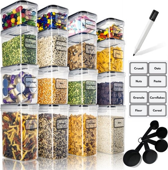Willkommen bei TNM – der Marke, die Ihr Zuhause in ein organisiertes, stilvolles und nachhaltiges Zuhause verwandeltUnsere hochwertigen und praktischen Haushaltsprodukte werden Ihnen helfen, Ihre Küche zu organisieren und Ihr Leben zu Hause zu verbessern. Unser Sortiment aus 10 verschiedenen Produkten wurde mit viel Liebe zum Detail und Stil entworfen, damit Ihr Zuhause nicht nur aufgeräumt aussieht, sondern auch gut aussieht. Außerdem werden unsere Produkte aus nachhaltigen Materialien hergestellt, die sowohl umweltfreundlich als auch funktional sind, und wir verkaufen sie jetzt in 5 europäischen Ländern. Ob Sie nun unsere beliebten Aufbewahrungsgläser oder andere praktische Aufbewahrungslösungen für die Küche suchen, bei TNM sind Sie an der richtigen Adresse. Unser Ziel ist es, Ihr Zuhause in eine organisierte und stilvolle Umgebung zu verwandeln, in der Sie Ruhe und Übersicht haben. Sehen Sie sich jetzt unser Sortiment an und entdecken Sie, wie TNM Ihr Leben einfacher und stilvoller machen kann! Wir denken mit unseren Kunden mit und wenn etwas nicht in Ordnung ist, können Sie sich jederzeit an uns wenden und wir werden bei Bedarf nachhaken. Wir schätzen das Feedback unserer Kunden, um die Produkte ständig zu verbessern.Schonen Sie die Umwelt:Mit diesen Behältern können Sie Ihre Lebensmittel ewig aufbewahren und Verpackung sparen. Bringen Sie die Behälter mit in den Laden und reduzieren Sie Einwegverpackungen. Perfekt für die Aufbewahrung in der Küche: Set von 16 Vorratsgläsern mit Deckel.Dieses 16er-Set umfasst 2L (4 Stück), 1.6L (8 Stück), 0.8L (4 Stück), kommt mit 24 Aufklebern, um aufbewahrte Lebensmittel zu markieren, 1 Stift und 4 große Messbecher Löffel. Geeignet für Mehl, Zucker, Snacks, Pop, Bio-Lebensmittel, Trockenfutter, Müsli, Getreide, Süßigkeiten oder andere Lebensmittel> Qualitätsmaterialien: Diese Vorratsdosen sind aus hochwertigem lebensmittelechtem Kunststoff, BPA-frei und FDA-zugelassen. Die Küchenvorratsdose kann gesund und sicher verwendet werden.> MULTIFUNKTIONALE AUFBEWAHRUNG: Jedes Vorratsglas ist mit einem Silikon-Dichtungsstreifen ausgestattet, um sicherzustellen, dass kein Wasser oder Luft eindringen kann. Dies erhöht die Frische und Gesundheit der luftdichten Vorratsgläser und hält die Körner frisch METRALTMs. Mit PRAKTISCHEN ETIKETTEN: Neben 4 Frischeboxen erhalten Sie auch 24 Etiketten, damit Sie niemals Mehl mit Puderzucker oder Backpulver mit Natron verwechseln können. Sie sind wiederverwendbar. Sie können den Inhalt jederzeit austauschen. Zum Austauschen einfach mit einem feuchten Tuch abwischen, abziehen und aufkleben, was Sie geschrieben haben. Außerdem gibt es 8 Aufkleber mit vorgeschriebenen Namen, die Sie sofort aufkleben können.>