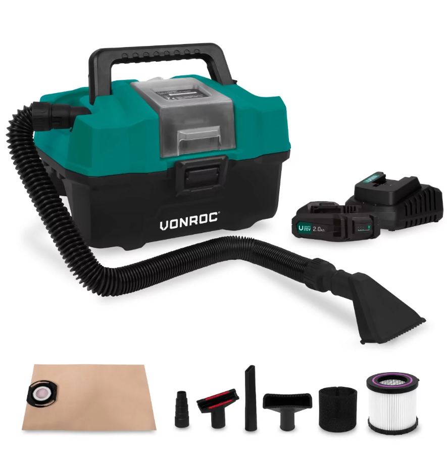 Der kompakte Allzwecksauger VONROC 20V ist die perfekte Lösung für alle Ihre Reinigungsaufgaben im Innen- und Außenbereich. Vom Saugen Ihres Autos, Wohnwagens oder Bootes bis hin zum Aufsaugen von Wasser nach einem Unfall – dieser Allzwecksauger ist für alles geeignet. Dank des leistungsstarken Akkus und des kabellosen Designs können Sie überall arbeiten, ohne lästige Verlängerungskabel. Darüber hinaus können Sie dieses vielseitige Gerät auch an Ihre Elektrowerkzeuge anschließen, um den Staub direkt abzusaugen und Ihren Arbeitsplatz jederzeit sauber und sicher zu halten.> Hauptvorteile des VONROC 20V Compact Allzweckstaubsaugers: Multifunktional:Dieser Allzwecksauger kann sowohl trocken als auch nass saugen und verfügt über eine Blasfunktion, um Gegenstände und schwer zugängliche Stellen schnell zu reinigen. Handlicher Akku: Dank des Akkus ist der Allzwecksauger kabellos und tragbar. Die mitgelieferten 2,0Ah-Akkus können für eine längere Betriebsdauer einfach durch leistungsstarke 4,0Ah-Akkus ersetzt werden. Benutzerfreundlichkeit: Der großzügige 15-Liter-Behälter muss nicht nach jeder Arbeit geleert werden, was ein effizientes, unterbrechungsfreies Arbeiten gewährleistet. Direkte Staubabsaugung: Schließen Sie den Staubsauger einfach mit dem mitgelieferten Adapter an Ihre Elektrowerkzeuge an und saugen Sie den Staub direkt während der Arbeit ab. Kompakt und tragbar: Mit einem stabilen Griff und leichtem Design können Sie den Allzweckstaubsauger überall hin mitnehmen. Flexibler Saugschlauch: Der flexible Saugschlauch kann bis auf das 4-fache seiner ursprünglichen Länge verlängert werden, so dass Sie immer dort zugreifen können, wo Sie es brauchen. Aufbewahrungsfunktion: Alle Zubehörteile können ordentlich in der Maschine selbst aufbewahrt werden, so dass Sie nicht mehr nach den richtigen Düsen suchen müssen. Ideal für: Auto, Wohnwagen oder Boot: Entfernen Sie Staub, Schmutz oder Feuchtigkeit schnell und effizient. Elektrowerkzeuge: Schließen Sie den Staubsauger an Ihre Schleifmaschine, Säge oder ein anderes Werkzeug an, um den Staub direkt abzusaugen. Sauberes Ausblasen: Nutzen Sie die Ausblasfunktion, um Werkzeuge und andere Oberflächen schnell sauber zu blasen. Feuchtigkeitsabsaugung: Saugen Sie Feuchtigkeit auf, zum Beispiel nach Leckagen oder Wasserunfällen. Was steckt in der umweltfreundlichen Verpackung? 1x VONROC 20V Compact Allzwecksauger 2x 2.0Ah Akku 1x Schnellladegerät 1x Ø32mm x 0,42m Teleskop-Kunststoffschlauch (verlängerbar auf 1,68m) 1x Ø32mm Bodendüse 1x Ø32mm Fugendüse 1x Ø32mm Möbeldüse 1x Adapter für Elektrowerkzeuge 1x Schaumstofffilter (zum Nasssaugen) 1x Staubsaugerbeutel 1x Waschbarer HEPA-Filter (für trockenes Saugen) VONROC VPower 20V Plattform Der VONROC Allzwecksauger ist Teil der VPower 20V Plattform, was bedeutet, dass Sie die mitgelieferten Akkus auch mit anderen VONROC Geräten verwenden können. So sparen Sie sich zusätzliche Akkus und Ladegeräte! Möchten Sie Ihren Allzwecksauger mit noch mehr Zubehör erweitern? Dann schauen Sie sich den separaten HEPA-Filter, Staubsaugerbeutel oder Adapter für Werkzeuge an.> Sind Sie bereit für ein aufgeräumtes Zuhause und einen aufgeräumten Arbeitsplatz? Bestellen Sie den VONROC 20V Compact Allzweckstaubsauger und erleben Sie den Komfort der kabellosen Reinigung!