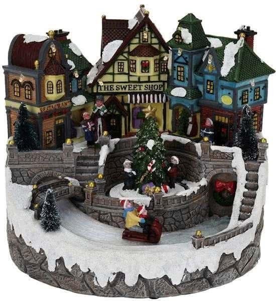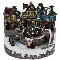 Weihnachtsatmosphäre eines Dorfes mit Animation und Lichter Diese Weihnachtsdekoration umfasst LED-Lichter (warmweiß), umgeben von Bäumen und Häusern. Das Set ist mit einem Adapter mit einem 180 cm langen Kabel versehen, so dass keine Batterien erforderlich sind. An der Unterseite befinden sich 4 rutschfeste Füße. Abmessungen: 21 x 24 x H21 cm.
